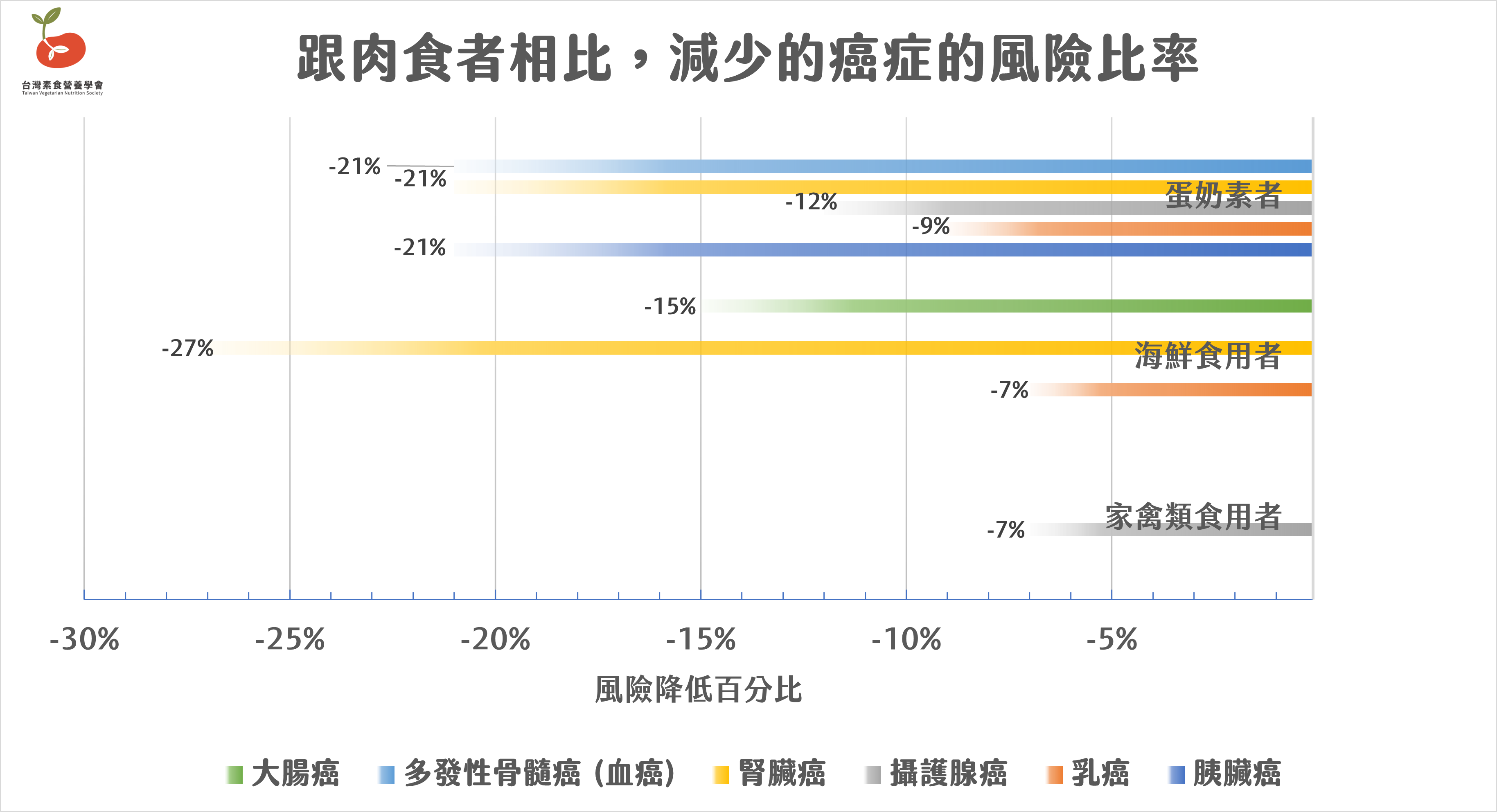 - 蛋奶素者:罹患胰臟癌、乳癌、攝護腺癌、腎臟癌及多發性骨髓瘤(血癌的一種)的風險,分別降低了 21%、9%、12%、21% 以及 21% 。